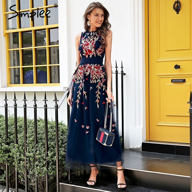 Simplee Elegant mesh overlay party dress women Stretch sleeveless vest long dress summer 2018 Embroidery black dress robe femme